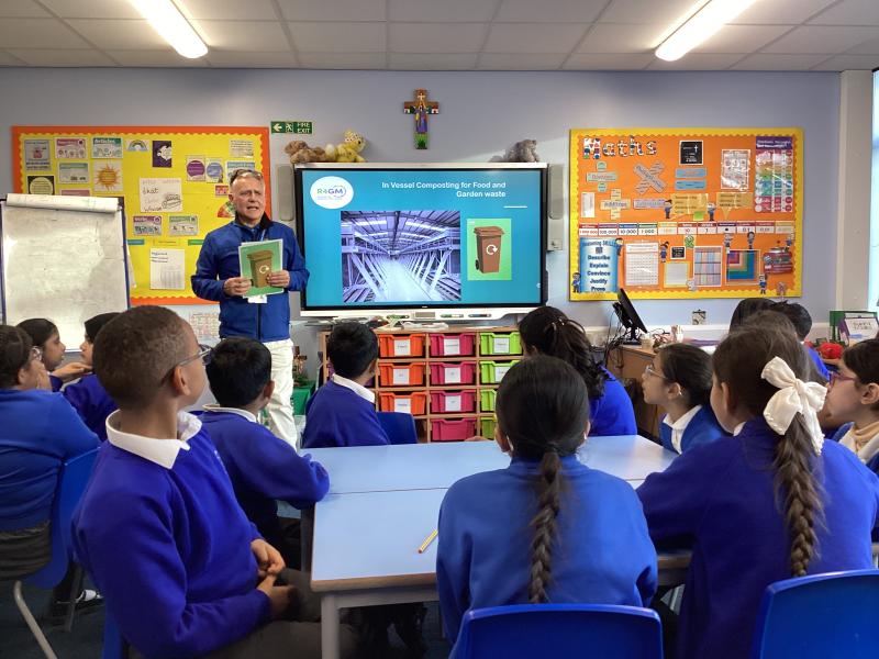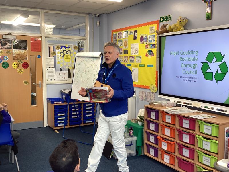 This week, Year 5 had a special visitor, Nigel Goulding, Environmental Education Officer at Rochdale Borough Council. Nigel told us so much information, from what items go in each coloured bin, to what actually happens to our recycled waste to create something new! We looked into how we can reduce the amount of waste we create; reuse items that can be repurposed; recycle ones that cannot and recover energy from our General Waste by burning it and harvesting electricty from the heat. We are now enviroment champions and we will be taking all our learning home so we are doing our best always for our environment.