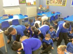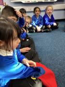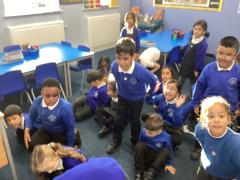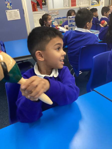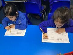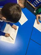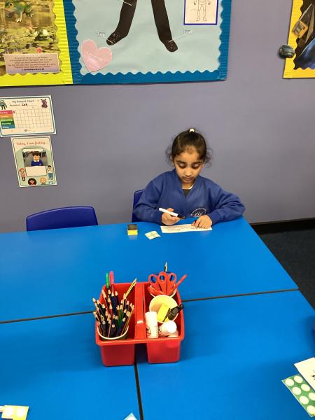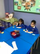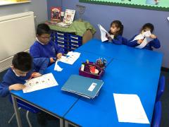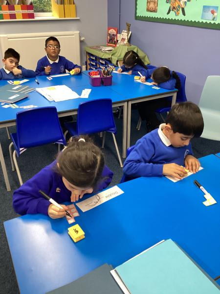 We also enjoy making up our own stories and bringing them to life using musical instruments and actions. Throughout the classroom, there are plenty of opportunities for writing in all areas. Each week, we learn new vocabulary linked to our current topic.