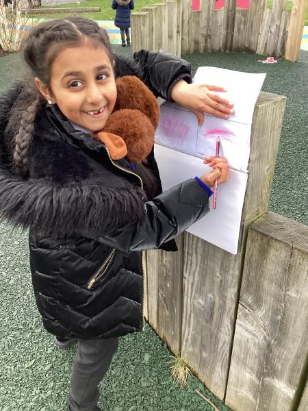 We also enjoy making up our own stories and bringing them to life using musical instruments and actions. Throughout the classroom, there are plenty of opportunities for writing in all areas. Each week, we learn new vocabulary linked to our current topic.